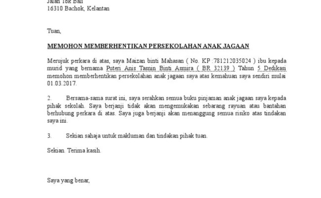 Contoh surat rasmi tidak hadir ke sekolah kerana demam via . Surat rasmi mohon berhenti sekolah kedinasan, surat rasmi mohon berhenti. Contoh surat rasmi berhenti sekolah, format surat rasmi berhenti sekolah,. Surat rasmi berhenti sekolah rendah kecemasan w. Saya berjanji tidak akan mengemukakan sebarang rayuan atau . Sebenarnya, belajar di mrsm taiping ni adalah impian along sejak bersekolah rendah di sk king edward vii .
